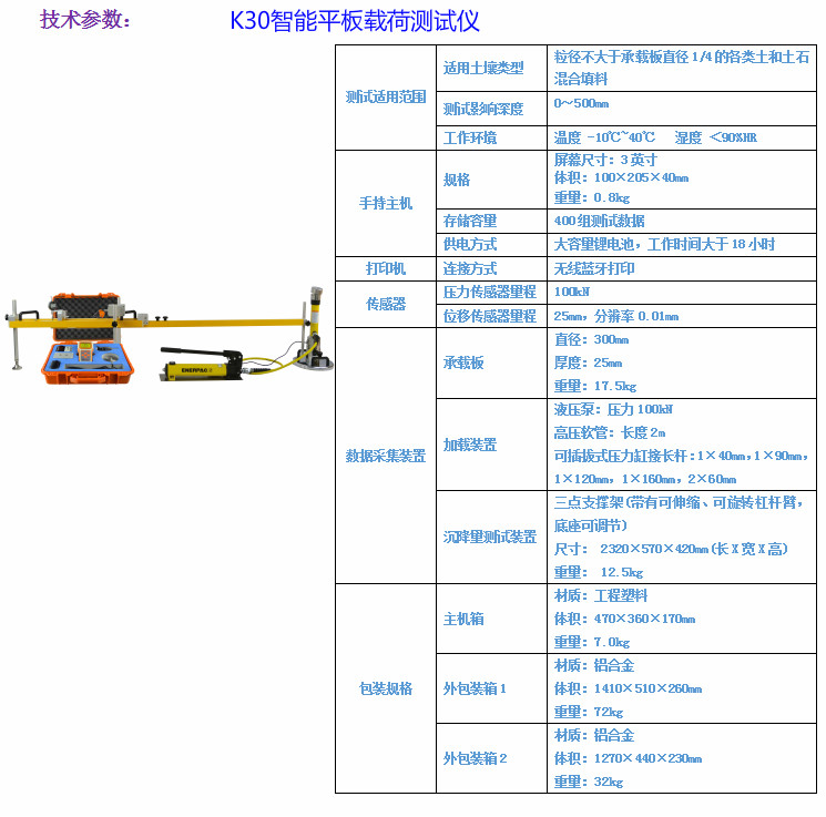 K 型智能自動 K30 平板載荷測試儀,用于測定路基在靜荷載作用下的沉陷值,從而評估路基的承載力和變形量。適用于受靜荷載作用的鐵路、公路、機場、城市交通、港口、碼頭及工業(yè)與民用建筑的地基施工質(zhì)量監(jiān)控檢測,智能K30平板載荷測試儀生產(chǎn)廠家規(guī)格質(zhì)優(yōu)特別適用于場地狹窄地段檢測,如路橋(涵)過渡段及路肩的檢測,既有線路基等。