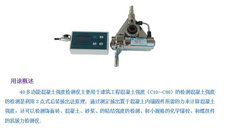 CF-40多功能混凝土強度檢測儀主要用于建筑工程混凝土強度(C10~C80)的檢測混凝土強度的檢測是利用后裝拔出法原理,通過測定拔出置于混凝土內錨固件所需的力來計算混凝土強度;還可以檢測飾面磚、馬賽克、保溫板、混凝土、砂漿、油漆、涂料、膠類的粘結強度的檢測、和小規格的化學錨栓、和螺紋件的抗拔力檢測儀。