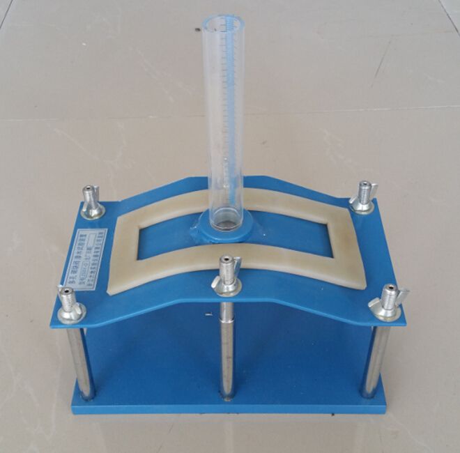 磚抗?jié)B試驗(yàn)裝置包括有蓄水筒、試件壓板、螺桿,試件壓板通過螺桿和螺母安裝于蓄水筒的底部下方,蓄水筒底板和試件壓板均設(shè)有直徑為50-80mm的圓孔。所述的蓄水筒的簡體高于105cm并于約100cm高處設(shè)有溢流孔。進(jìn)行試驗(yàn)時,通過螺栓、螺桿將試件緊固安裝在蓄水筒與壓板之間,砌墻磚抗?jié)B試驗(yàn)裝置 多孔磚滲水試驗(yàn)儀生產(chǎn)廠家質(zhì)優(yōu)通過蓄水筒中一定水位高度的水向筒底部的試件施加水壓,經(jīng)過一段時間后,檢驗(yàn)試件的剖面的水滲透深度來評價試件的抗?jié)B性。
